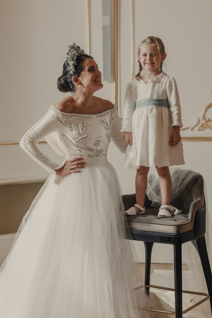 Zlatá hotelová sála sa medzitým premenila na veľký beauty ateliér. Priestor, kde sa bežne konajú hlavné eventy, sme úplne transformovali — desiatky žien sa pripravovali, prebiehali make-up a hairstyling. V strede miestnosti bola vystavená svadobná róba ako centrálny prvok celého priestoru. Každý moment príprav sa stal súčasťou zážitku. Tie biele šaty s červenou podšívkou a ručne vyšívanými srdcami boli šaty na welcome party predošlého večera od Borisa Hanečku.