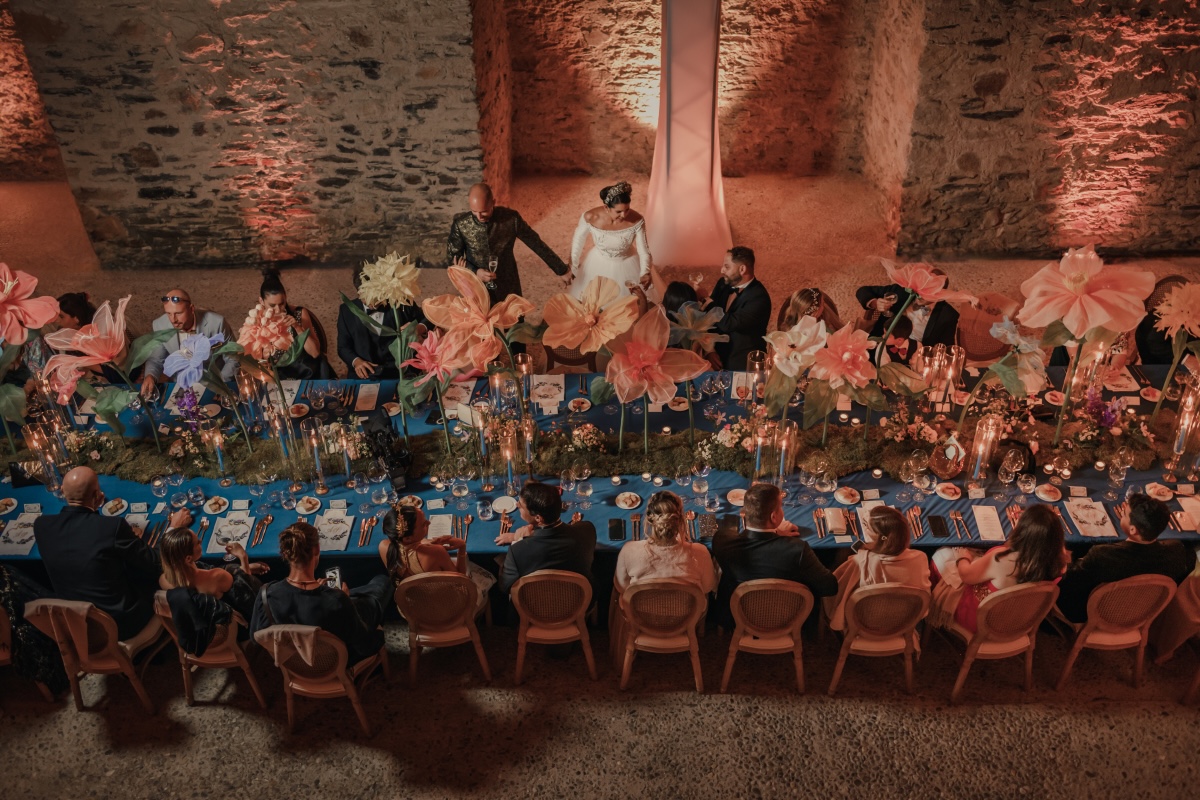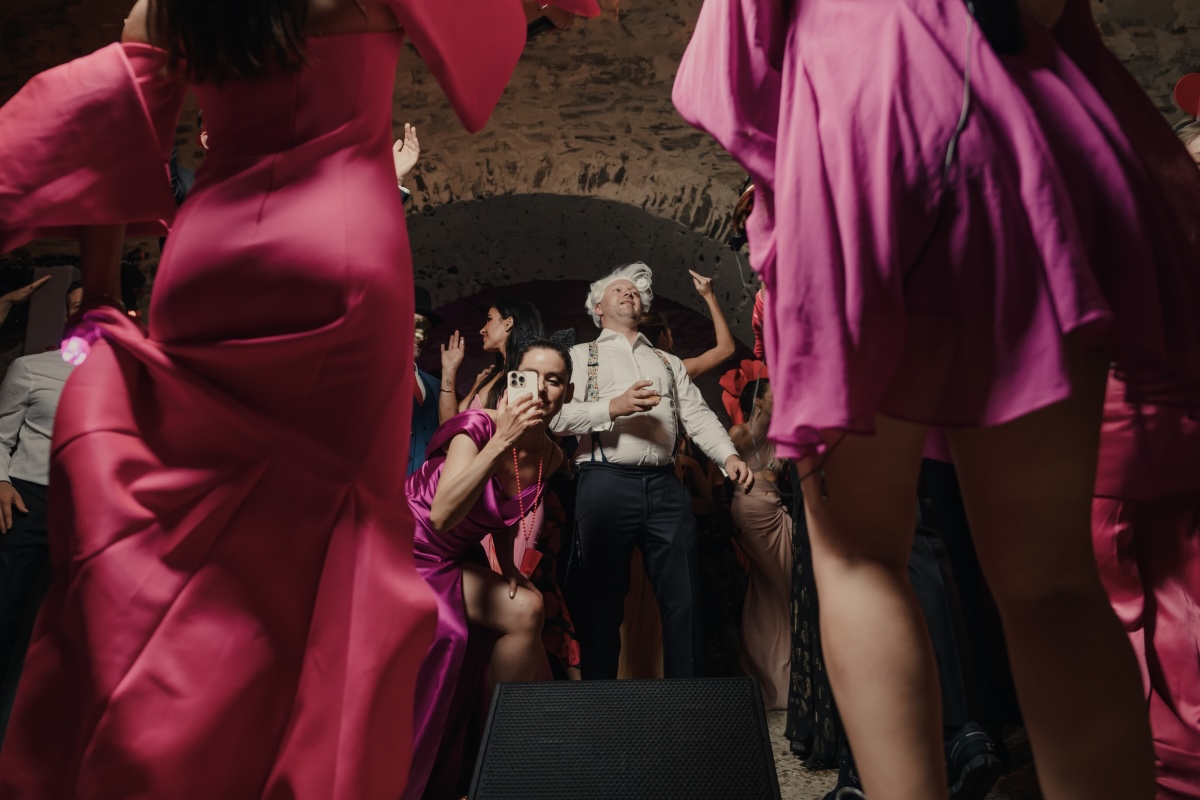Naši hostia očakávali plesovú sálu. Namiesto toho sa nádvorím rozoznel slávnostný zvuk trúbky, ktorý elegantne uzavrel kokteilovú hodinu a plynule nasmeroval všetkých do ďalšej časti večera. Ako posledné tóny doznievali medzi hradnými múrmi, hostia sa začali presúvať do stredovekých pivníc — jedných z najväčších v strednej Európe. Počas ich zostupu po schodoch na medziposchodí ich sprevádzala jemná hra harfistky.
