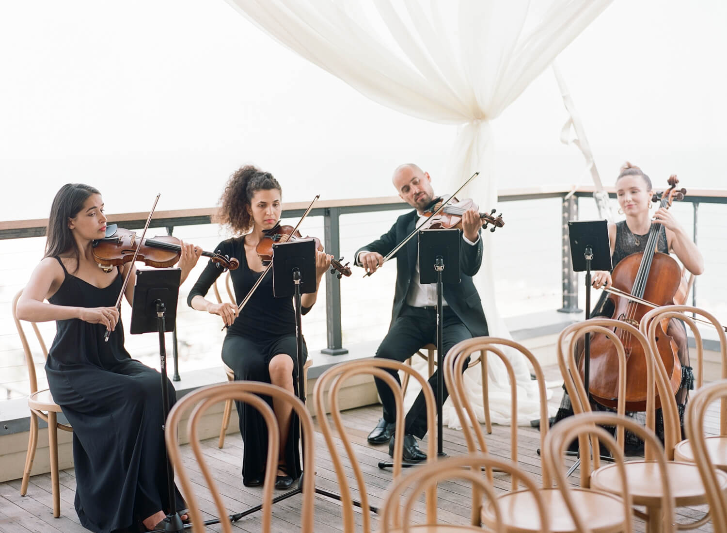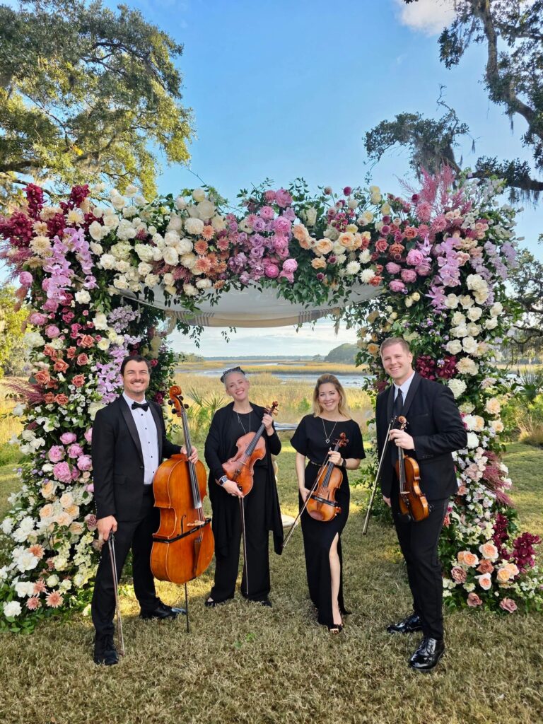 Both ensembles exude elegance and excellence in sound. The main difference is the number of musicians. A string quartet has four players, giving it a fuller, richer, and more powerful sound. A trio has three musicians, which makes it slightly lighter and more intimate. For smaller weddings or venues, a trio provides the perfect atmosphere without being overwhelming, while still offering a polished and sophisticated sound. For larger guest counts (200+), outdoor ceremonies, or performances lasting more than two hours, we strongly recommend the string quartet, as it projects better and provides a more dynamic range.